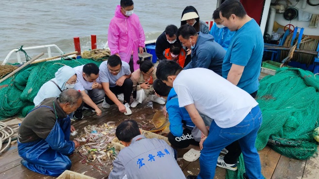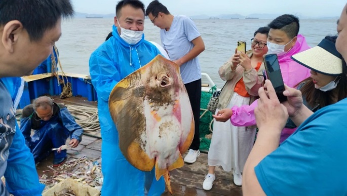 最讓人難忘的節(jié)目總是壓軸出場。28日5點(diǎn)鐘的晨陽拉開了我們出海拖網(wǎng)的帷幕。漁船上紅旗迎風(fēng)飄揚(yáng),海浪時高時低,云彩浮動,海鳥相隨,我們乘風(fēng)破浪,出海做個漁民,暈船與拍照此時也能和平共處。半個時辰光景,船工大哥幫我們收了網(wǎng),拉上一個巨大的、怪怪的魚,還有很多很多魚蝦生鮮,頭一次收獲這么多海鮮,還有一個巨無霸,大家無比激動,個個蹲在甲板上圍觀,相機(jī)定格了此時的畫面,真是一群三四十歲的“大孩子”……